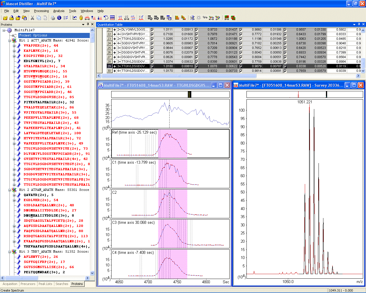 This protocol requires information from the raw data file that is not present in the peak list, so the quantitation report is generated in Mascot Distiller, which has access to both the Mascot search results and the raw data.