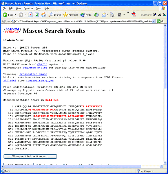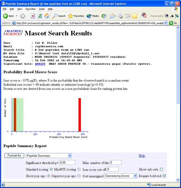 Mascot search reports are generated on the fly by the Mascot server. This provides great flexibility, allowing a report to be re-formatted easily. The reports also make extensive use of HTML hyperlinks, allowing you to ‘drill down’ to other views of the data, such as the Protein View or the Peptide View.