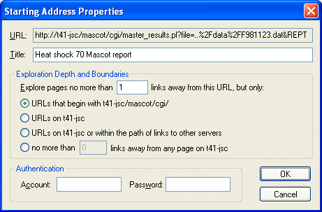 Copy the Report URL from the web browser address bar (CTRL+C) and paste into the URL field of the Teleport Pro Starting Address properties dialog (CTRL+V). Set the exploration depth to 1 link away from the starting URL, and limit URL’s to the Mascot server cgi directory. A project title is optional.