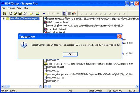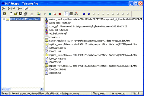 Teleport Pro will then proceed to save off-line copies of the top level report and all the linked reports. This will include a complete set of Protein and Peptide View reports for all the displayed protein hits and queries. If the report is a large one, this may take some time.